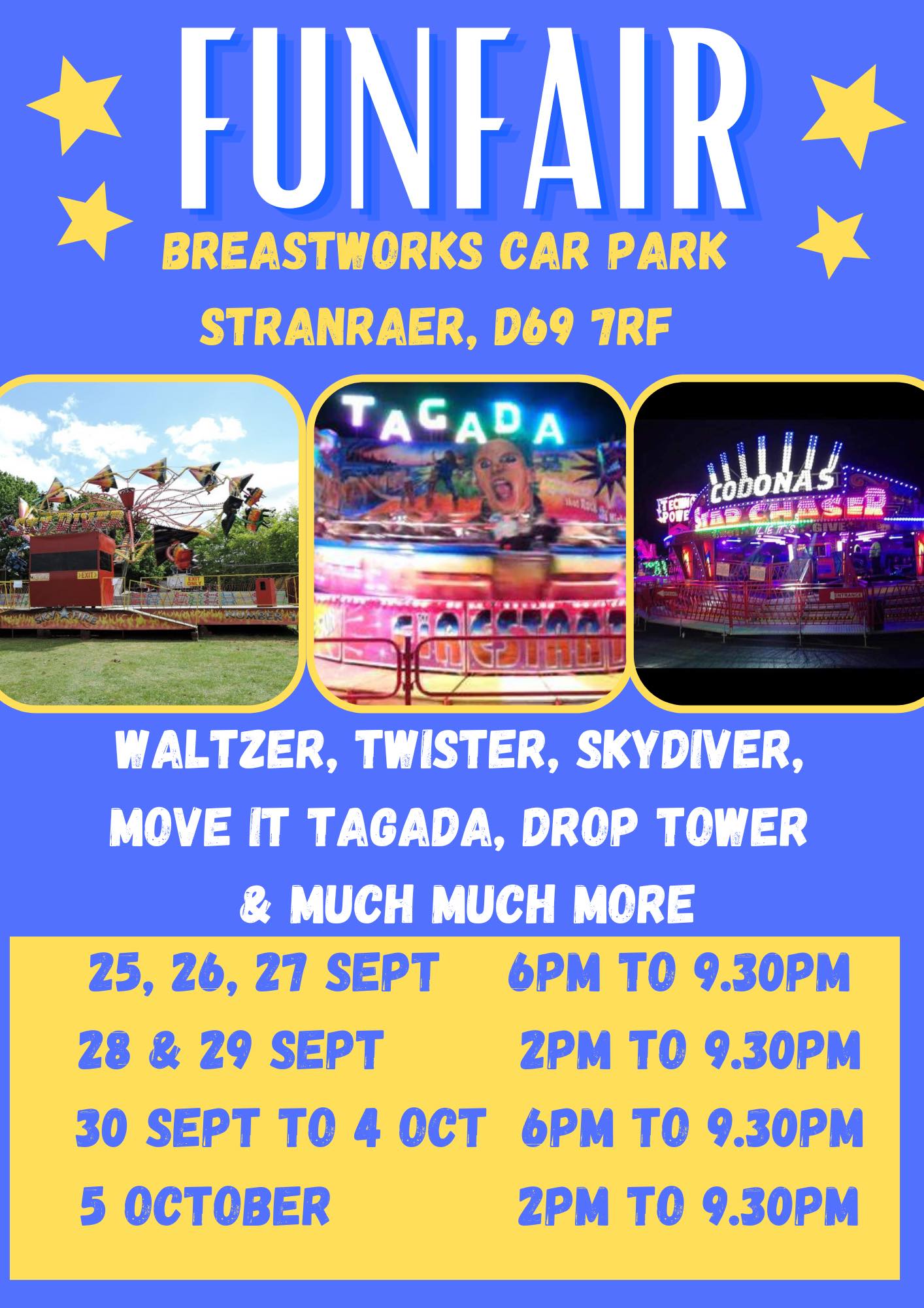 | 25th September | 5th October | STRANRAER | Breastworks Car Park | Codonas | D69 7RF | Poster |