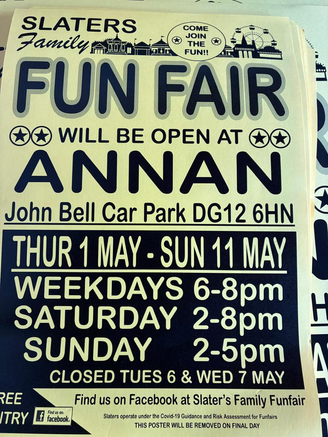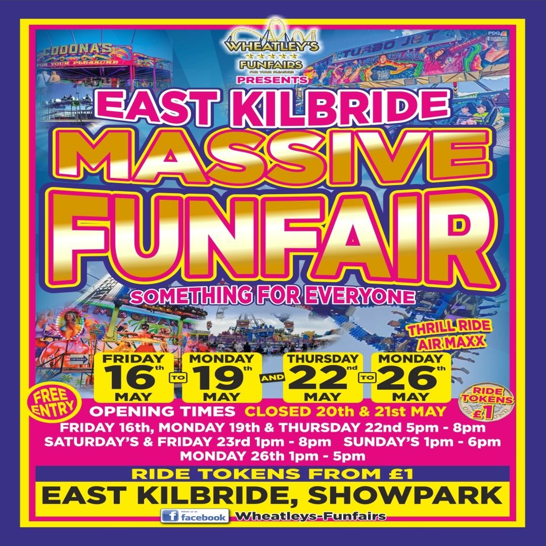 24th April-3rd May ALLOA, FK10 1LR West End Park Jordan Evans --> Poster <-- 24th April-5th May CUMBERNAULD, G67 1BU Shopping Centre Codonas --> Poster <-- 25th April-5th May KILMARNOCK, KA1 3FX Rugby Club Funtime Carnivals --> Poster <-- 25th April-5th May STONEHAVEN, AB39 2EQ Baird Park Wallis's --> Poster <-- 25th April-11th May DUNDEE, DD4 9BX Caird Park Hornes --> Poster <-- 25th April-11th May IRVINE, KA12 8SA Moor Park Thomsons Events Group --> Poster <-- 25th April-11th May MUSSELBURGH, EH21 6JR Fisherrow Links Taylors of Edinburgh --> Poster <-- 1st-5th May AIRDRIE, DD4 9BX Katherine Park Trevor Smith --> Poster <-- 1st-10th May MONTROSE, DD10 8TR The Links Evans Funfairs --> Poster <-- 1st-11th May ANNAN, DG12 6HN John Bell Car Park Slaters --> Poster <-- 2nd-11th May WESTER HAILES, EH14 2SW Westside Centre MT Attractions --> Poster <-- 7th-11th May BERWICK, TD15 2EF Football Stadium Wesley Smith --> Poster <-- 7th-11th May STEVENSTON Beach Park Stirlings --> Poster <-- 8th-11th May AIRDRIE, ML6 8PE Katherine Park Trevor Smith --> Poster <-- 8th-11th May ALNWICK, NE66 2AH Recreation Park Slaters --> Poster <-- 8th-11th May INVERKEITHING, KY11 1DS Ballast Bank Wheatleys --> Poster <-- 8th-11th May MONIFIETH Riverview Park W&H Funfairs --> Poster <-- 8th-18th May ELGIN Auction Mart Herchers --> Poster <-- 9th-18th May GREENOCK Victoria Harbour Funtime Carnivals --> Poster <-- 11th May GOUROUCK, PA16 7QC Battery Park Cameron Codona --> Poster <-- 14th-24th May FORFAR, DD8 1AZ The Myre Evans Funfairs --> Poster <-- 15th-18th May COATBRIDGE, ML5 1DL Time Capsule Codonas --> Poster <-- 15th-18th May KINROSS Market Park W&H Funfairs --> Poster <-- 16th-18th May DANDERHALL, EH22 1QU Miners Club Taylors of Edinburgh --> Poster <-- 16th-19th May EAST KILBRIDE Showground Wheatleys --> Poster <-- 16th-26th May ARDROSSAN, KA22 8DJ South Beach Wesley Smith --> Poster <-- 16th-26th May JOHNSTONE, PA5 8NH Shanks Park Trevor Smith --> Poster <-- 16th-31st May INVERNESS, IV3 5SR Bught Park Hornes --> Poster <-- 22nd-25th May CRIEFF Market Park W&H Funfairs --> Poster <-- 22nd-25th May LESMAHAGOW, ML11 0BA Kelso Avenue Justin Codona --> Poster <-- 22nd-26th May EAST KILBRIDE Showground Wheatleys --> Poster <-- 22nd-26th May LINWOOD, PA3 3DB Playing Fields Funtime Carnivals --> Poster <-- 22nd-31st May ROSYTH, KY11 2QT Public Park Stirlings --> Poster <-- 22nd May-1st June AMBLE, NE65 0AP Little Shore Jimmy Slater --> Poster <-- 23rd-25th May DRUMBRAE, EH4 7SF Leisure Centre Taylors of Edinburgh --> Poster <-- 23rd-26th May BRAEHEAD Xsite Car Park Hiscoes --> Poster <-- 23rd-26th May WISHAW, ML2 0GA Beltane Park Cameron Codona --> Poster <-- 28th-31st May PENICUIK, EH26 9EP Angle park Taylors Of Edinburgh --> Poster <-- 28th May-1st June LARKHALL Next to Academy Stirlings --> Poster <-- 29th May-9th June HAWICK, TD9 7AH Victoria Road Scottish Showmans Guild --> Poster <-- 30th-31st May WISHAW, ML2 0GA Beltane Park Cameron Codona --> Poster <-- 31st May DENNY, FK6 6JR Herbertshire Park Sheldon Johnstone --> Poster <-- 31st May DRYMEN, G63 0EY Drymen Showfield ?? --> Poster <-- 31st May-24th August BURNTISLAND, KY3 9EB Links Park Scottish Showmans Guild --> Poster <--